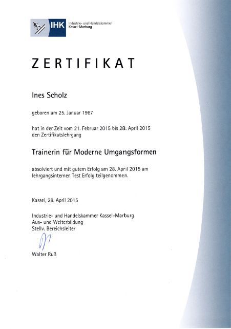 Ich bin Trainerin für Moderne Umgangsformen mit IHK-Abschluss.